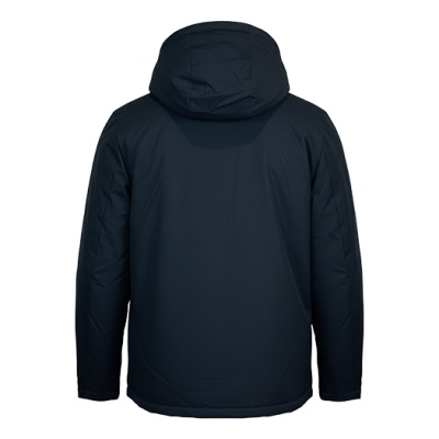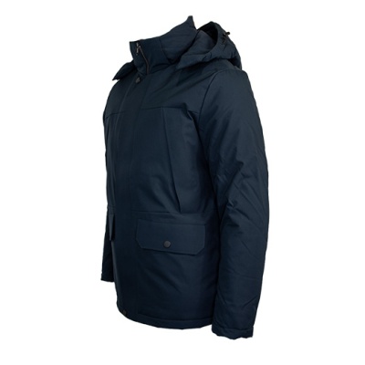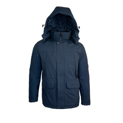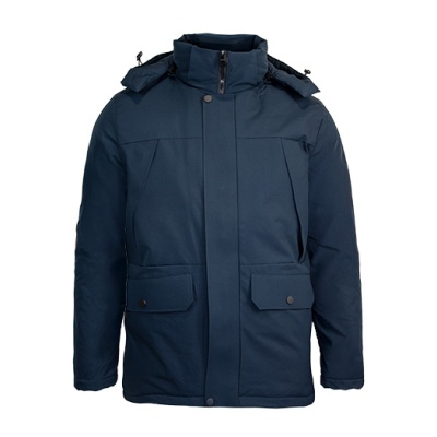 Ce manteau bleu marin est idéal pour vos déplacements en ville, offrant chaleur grâce à sa capuche amovible et sa fermeture sécurisée.